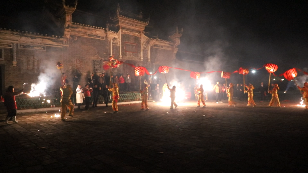 當(dāng)晚在甘家?guī)X村甘宗祠前,燈火通明,人聲鼎沸,村民們手舉火龍伴隨著激昂的鑼鼓聲在夜色中舞動(dòng)。