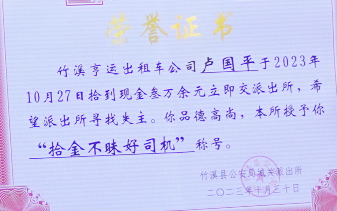 “盧國平,你品德高尚,本所授予你‘拾金不昧好司機’稱號。”