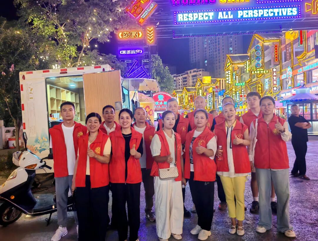 8月15日,竹溪武陵不夜城光影街開街當晚,人潮涌動、熱鬧非凡,游人如織的街區隨處可見身穿紅馬甲的志愿者。縣文化館干部洪雪梅和縣農村公益電影放映辦干部彭濤均是志愿服務隊伍中的一員。
