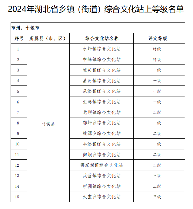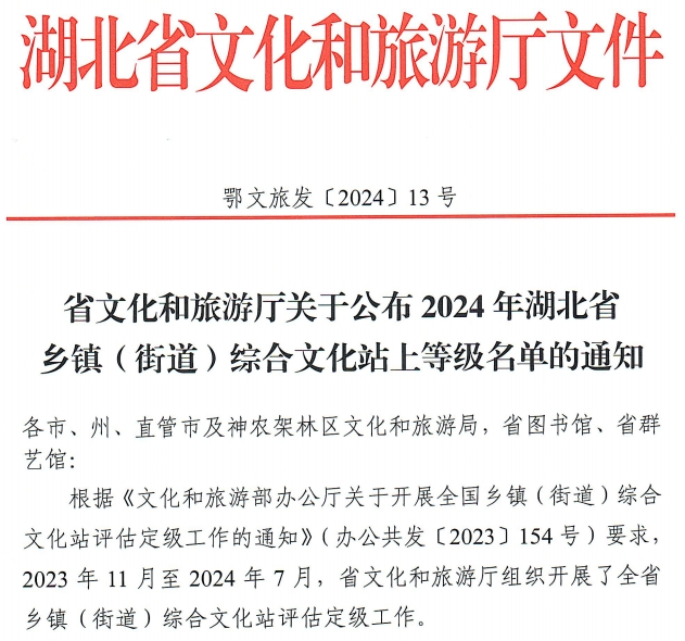 近日,湖北省文化和旅游廳公布了2024年湖北省鄉(xiāng)鎮(zhèn)(街道)綜合文化站上等級名單。我縣15個鄉(xiāng)鎮(zhèn)綜合文化站均定為三級以上等級,其中水坪鎮(zhèn)綜合文化站、中峰鎮(zhèn)綜合文化站被定級為“特級站”。