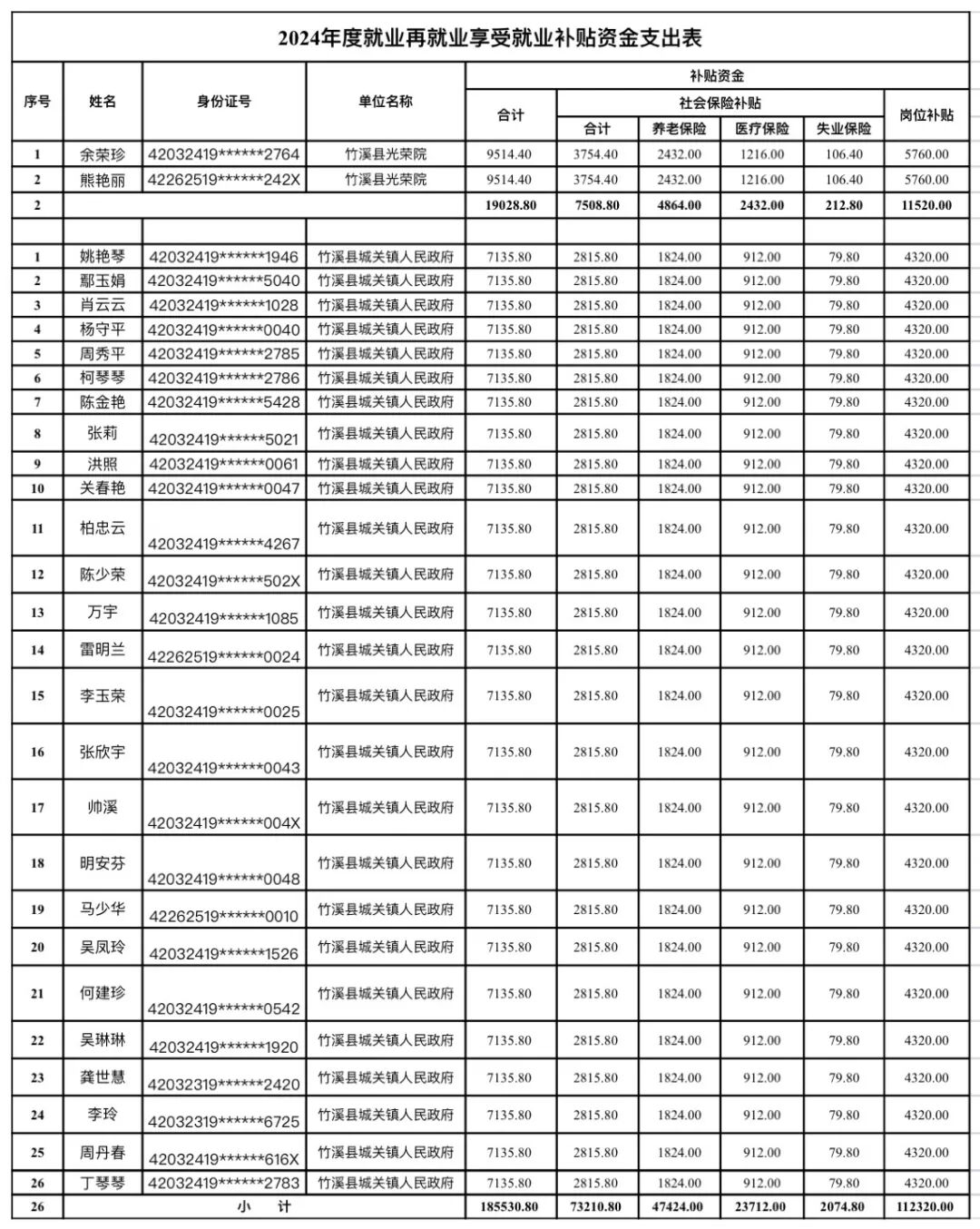 根據《湖北省就業補助資金管理辦法》(鄂財社發〔2017〕102號)文件精神,竹溪縣公共就業和人才服務局受理縣光榮院、城關鎮人民政府等2家單位申請享受就業補助政策28人,擬撥付就業補助資金204559.60元;其中:公益性崗位補貼123840.00元,社會保險補貼80719.60元。
