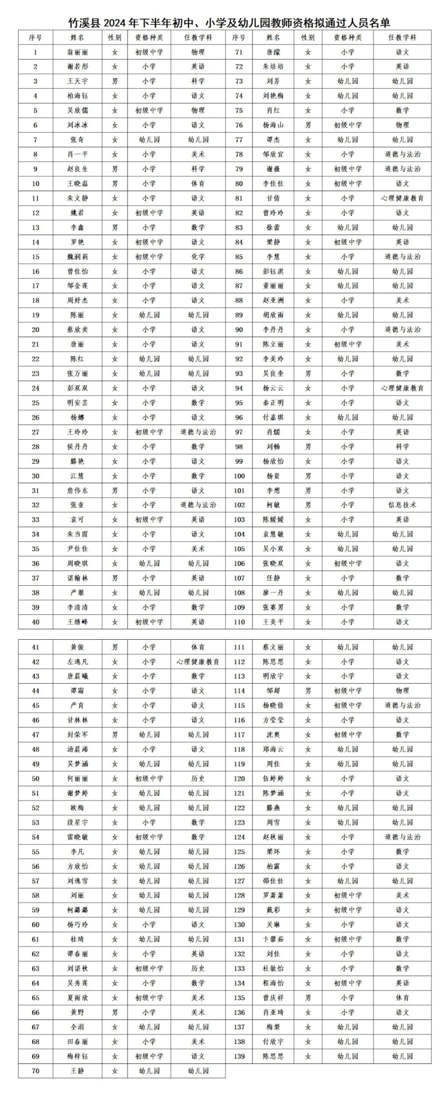 根據湖北省教師資格管理辦公室《關于做好2024年我省中小學教師資格制度實施工作的通知》要求,經申請人在《中國教師資格網》網上申報、竹溪縣教育局現場審核確認、竹溪縣教師資格專家審查委員會審查,擬對139人初中、小學及幼兒園教師資格認定,現將名單予以公示。公示時間為10月11日至17日。公示期內,如有不同意見,可通過電話、電子郵件或書信等方式據實向竹溪縣教師資格專家審查委員會實名反映。