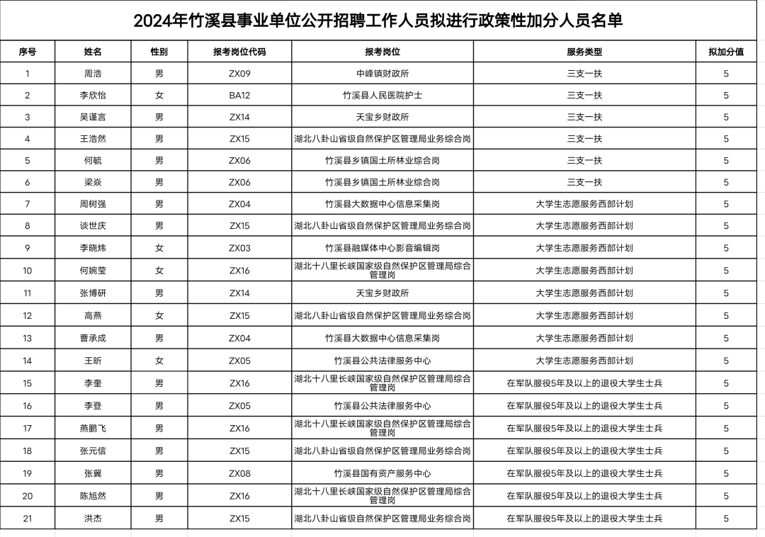 11月27日,竹溪縣人力資源和社會保障局在竹溪政府網發布《2024年竹溪縣事業單位公開招聘工作人員擬進行政策性加分人員公示》,擬為這21人進行政策性加分。