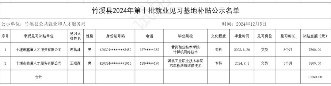 經見習單位申請,縣公共就業和人才服務局初審,縣人社局審核,2024年6月-11月竹溪縣城關鎮金竹棒棒幼兒園吸納就業見習人員1人,符合享受見習補貼金額7560元;十堰市鑫道人才服務有限公司吸納就業見習人員2人,符合享受就業見習補貼13860元,現對擬享受就業見習補貼見習基地予以公示,公示期分別為2024年12月2日至2024年12月8日共計7天、2024年12月5日至2024年12月11日共計7天。請社會各界監督,如有不實請向縣公共就業和人才服務局舉報,監督舉報電話:0719-2727779、2726337。