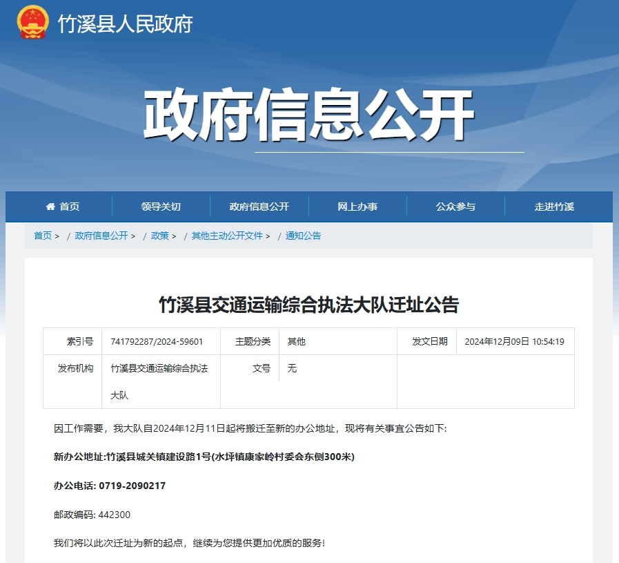 日前,竹溪縣交通運輸綜合執法大隊在竹溪政府網發布遷址公告。自今日(2024年12月11日)起,竹溪縣交通運輸綜合執法大隊將搬遷至新的辦公地址辦公,竹溪縣城關鎮建設路1號(水坪鎮康家嶺村委會東側300米)。