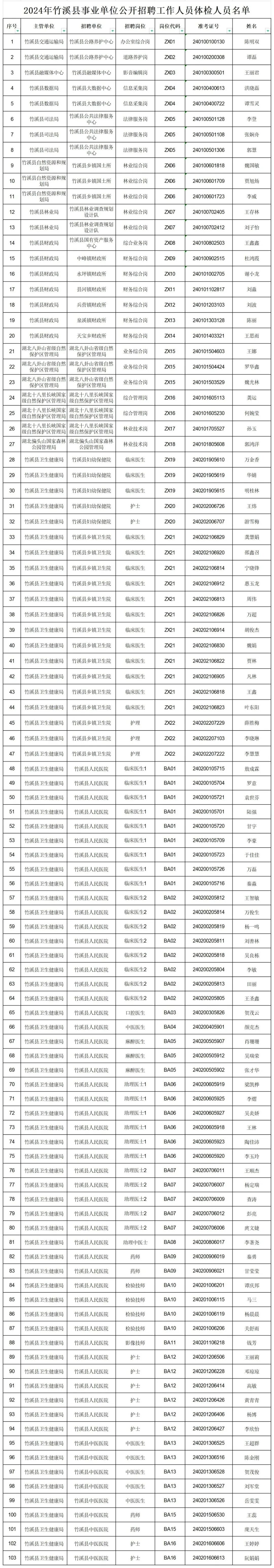 12月27日,竹溪政府網發布2024年竹溪縣事業單位公開招聘工作人員體檢和考察公告,體檢人員名單如下: