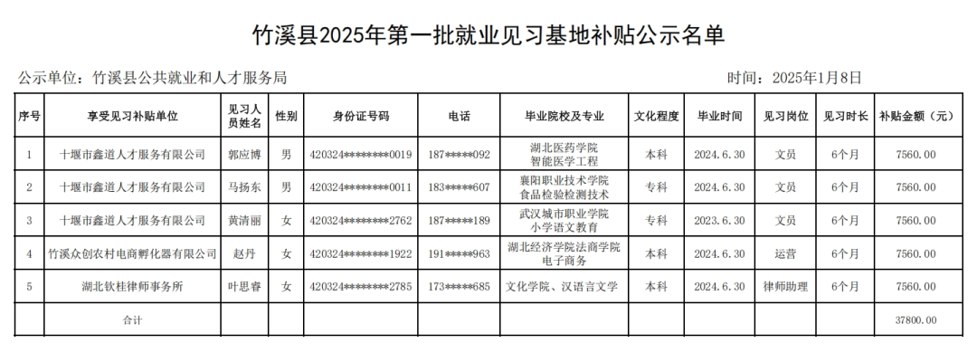 竹溪縣2025年第一批見習基地就業見習補貼的公示