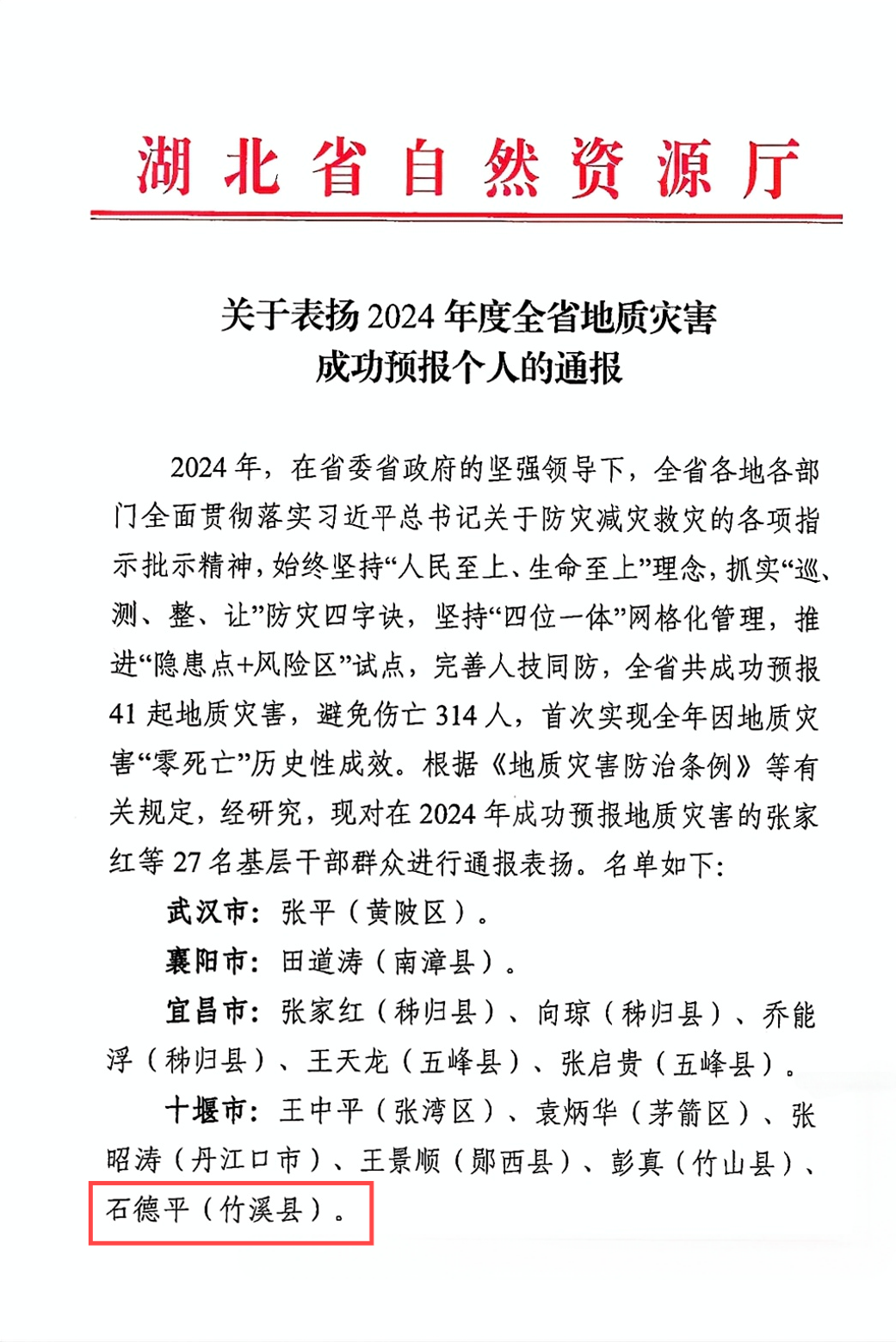 日前,全省地質災害“隱患點+風險區”雙控體系建設工作現場推進會在宜昌秭歸召開,通報表揚全省2024年度24起成功避險典型案例的相關預警預報人員,其中竹溪1人獲此表揚。詳情如下: