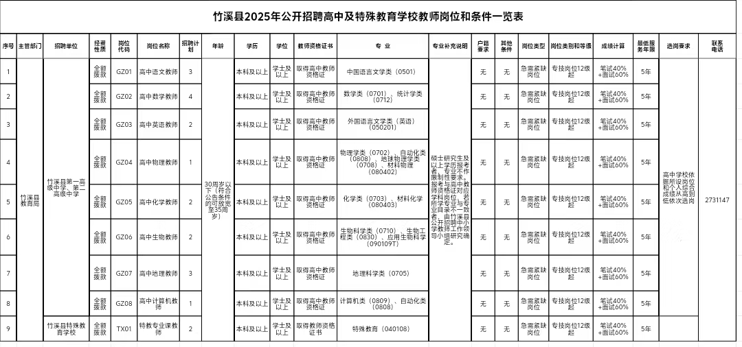 1.竹溪縣2025年公開招聘高中及特殊教育學(xué)校教師崗位和條件一覽表;