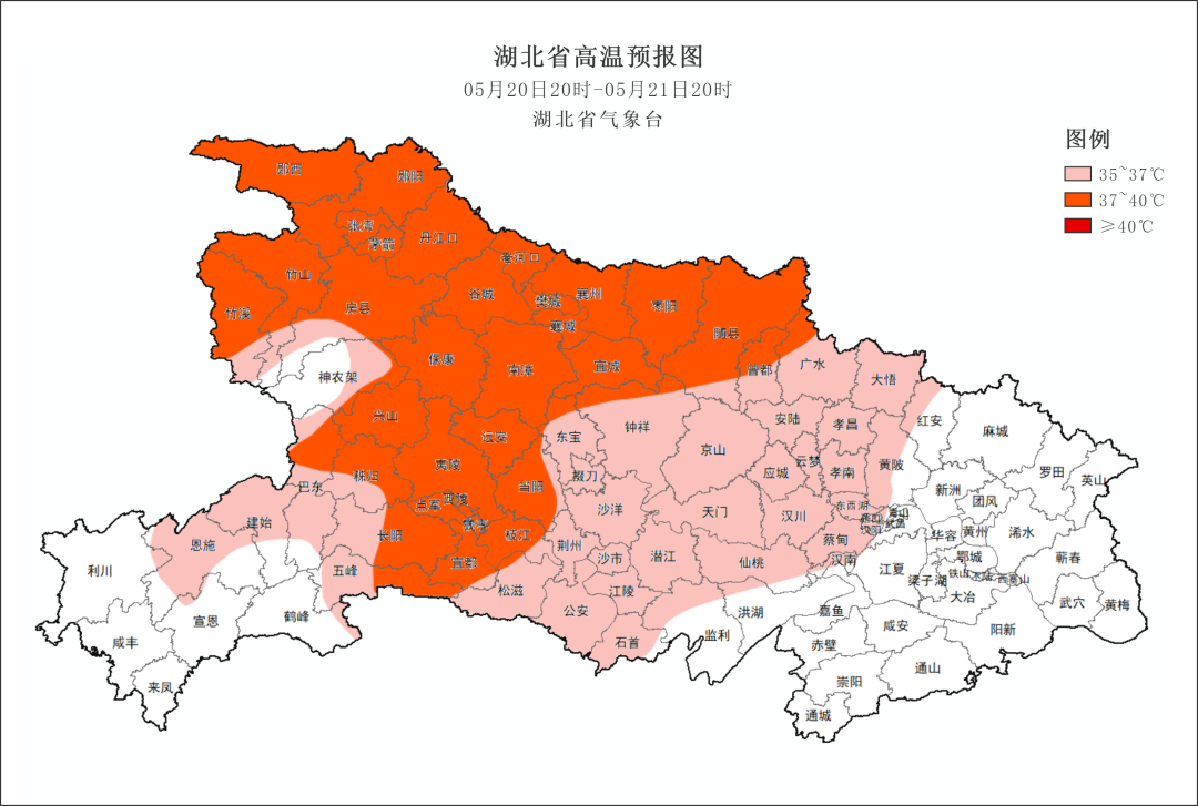 預計21日白天,十堰、襄陽、宜昌、恩施北部、荊門、荊州西部、隨州、孝感、武漢、潛江、天門、仙桃地最高氣溫將升至35℃以上,其中十堰、襄陽、隨州、宜昌可達37~39℃,局地40℃,請注意防范!