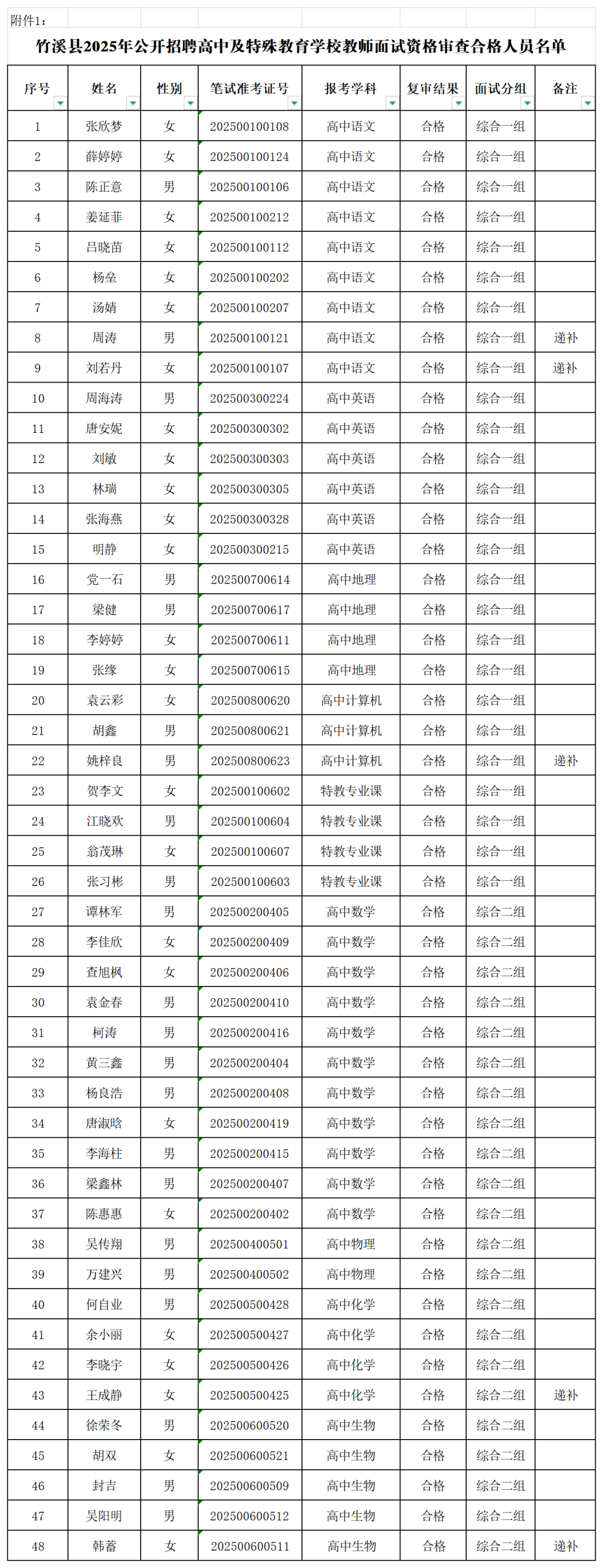 1.竹溪縣2025年公開招聘高中及特殊教育學校教師面試資格審查合格人員名單;