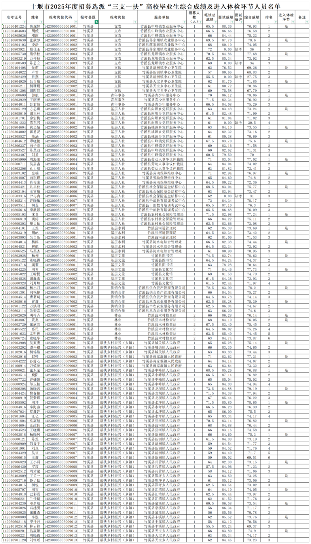 十堰市2025年度招募選派“三支一扶” 高校畢業生綜合成績及進入體檢環節人員公示