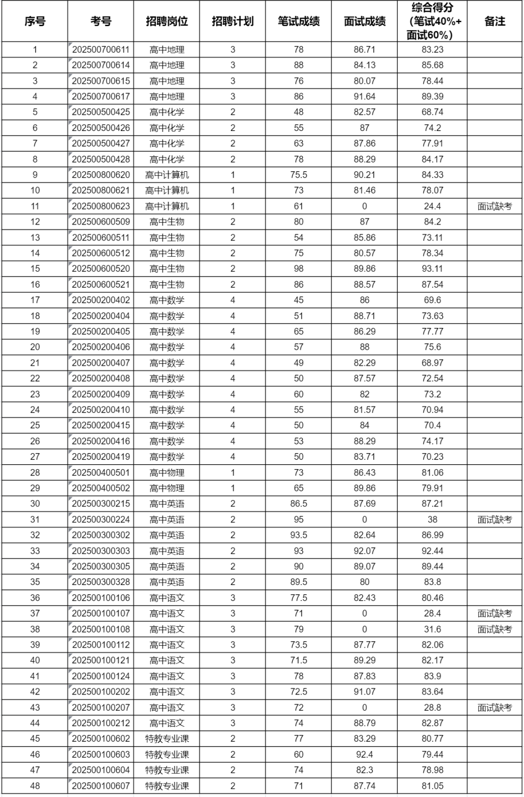 根據(jù)《竹溪縣2025年公開招聘高中及特殊教育學(xué)校教師公告》和有關(guān)規(guī)定要求,竹溪縣2025年公開招聘高中及特殊教育學(xué)校教師面試工作已結(jié)束,現(xiàn)將面試成績、綜合成績公示如下: