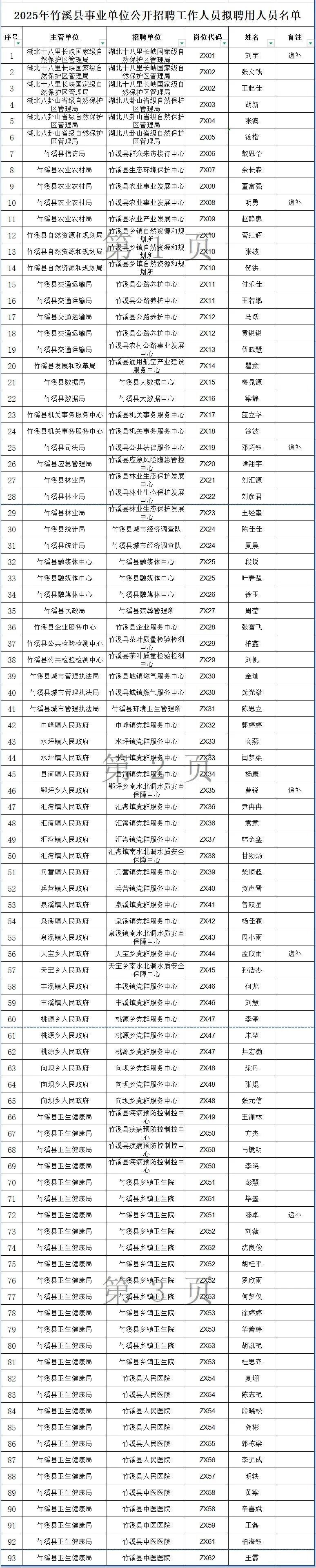 剛剛,2025年竹溪縣事業單位公開招聘工作人員擬聘用人員公示。