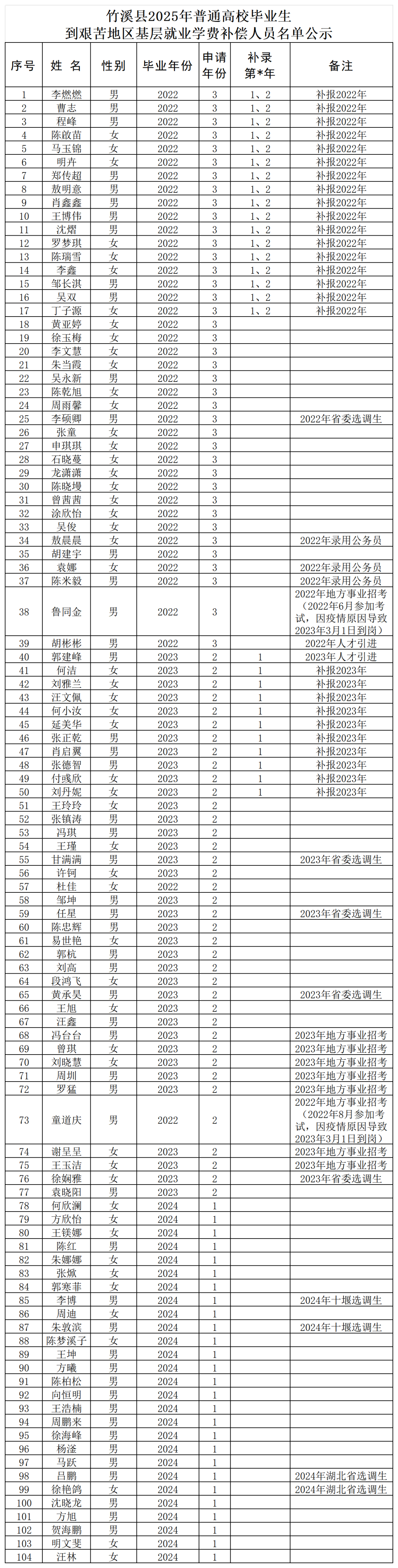 根據《省財政廳 省教育廳 省人力資源和社會保障廳 省退役軍人事務廳 省人民政府征兵辦公室關于印發〈湖北省學生資助資金管理辦法〉的通知》(鄂財教發〔2023〕58號)、《湖北省學生資助管理中心關于開展2025年普通高校畢業生到艱苦地區基層單位就業學費補償工作的通知》及《縣委組織部等四部門關于印發〈高校畢業生到竹溪縣基層單位就業學費補償工作實施方案〉的通知》(溪教字〔2018〕50號)等文件要求,現將2022年應屆畢業申請第3次、2023年應屆畢業申請第2次、2024年應屆畢業申請第1次,符合學費補償條件的104人次名單予以公示。