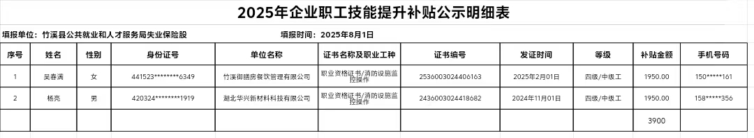 根據《湖北省人力資源和社會保障廳湖北省財政廳關于實施失業保險技能提升差異化補貼政策的通知》(鄂人社發〔2025〕10號)文件及《湖北省人力資源和社會保障廳湖北省財政廳國家稅務總局湖北省稅務局關于深入做好失業保險穩崗惠民促就業工作的通知》(鄂人社發〔2025〕15號)文件精神,竹溪縣公共就業和人才服務局受理竹溪御膳房餐飲管理有限公司、湖北華興新材料科技有限公司等2家企業2人技能提升補貼申請,補貼資金3900.00元。