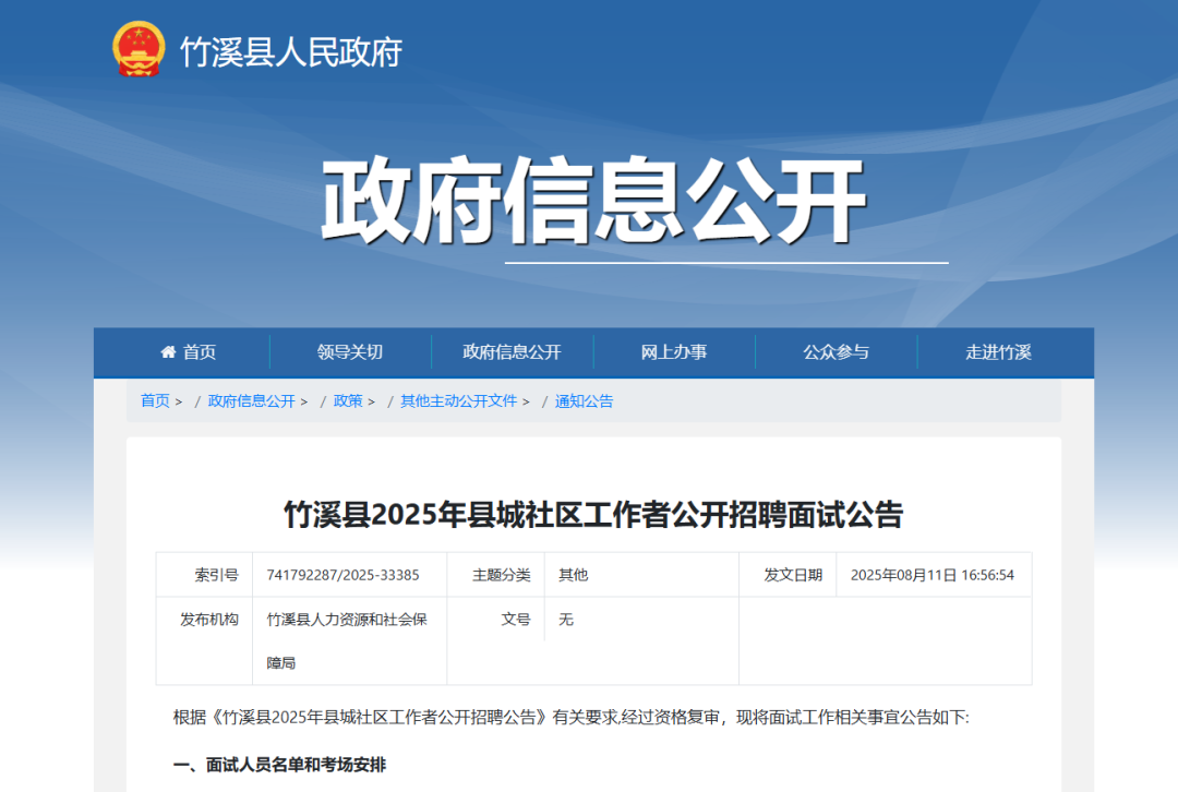日前,竹溪縣人力資源和社會保障局在竹溪政府網發布竹溪縣2025年縣城社區工作者公開招聘面試公告。