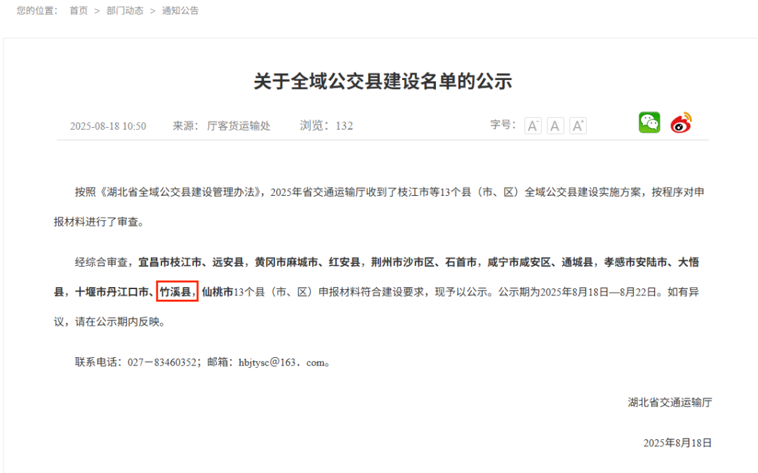 日前,湖北省交通運輸廳在官網發(fā)布《關于全域公交縣建設名單的公示》。竹溪縣榜上有名: