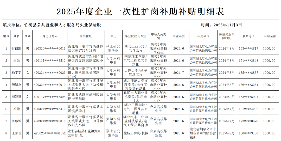 根據《湖北省人力資源和社會保障廳辦公室關于做好一次性擴崗補助發放經辦工作的通知》(鄂人社辦函〔2024〕39號)文件精神及湖北省就業促進和勞動保護工作領導小組關于印發《湖北省加力落實穩就業政策措施實施方案的通知》(鄂就勞發〔2025〕5號),竹溪縣公共就業和人才服務局受理湖北省煙草公司十堰市公司竹溪縣營銷部、國網湖北省電力有限公司竹溪縣供電公司等2家企業8人申請一次性擴崗補助補貼政策,擬撥付企業一次性擴崗補助資金9500.00元。