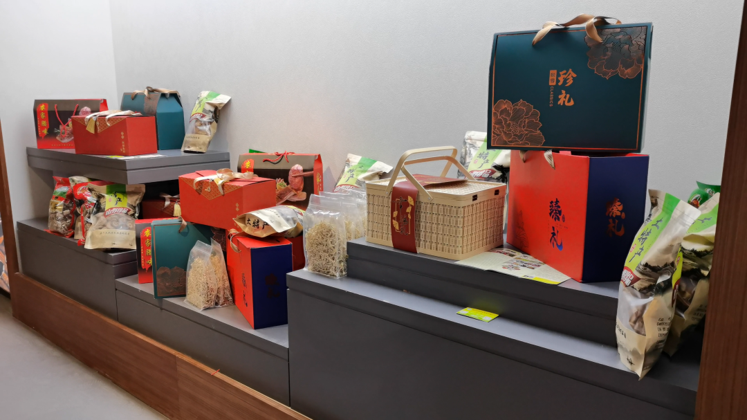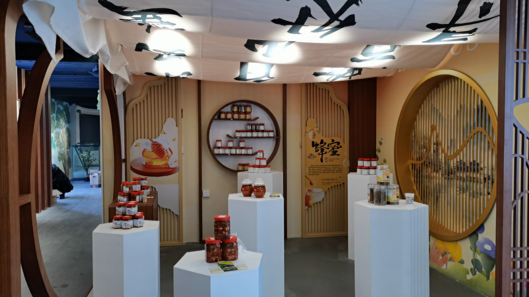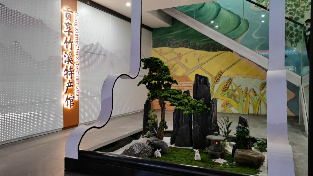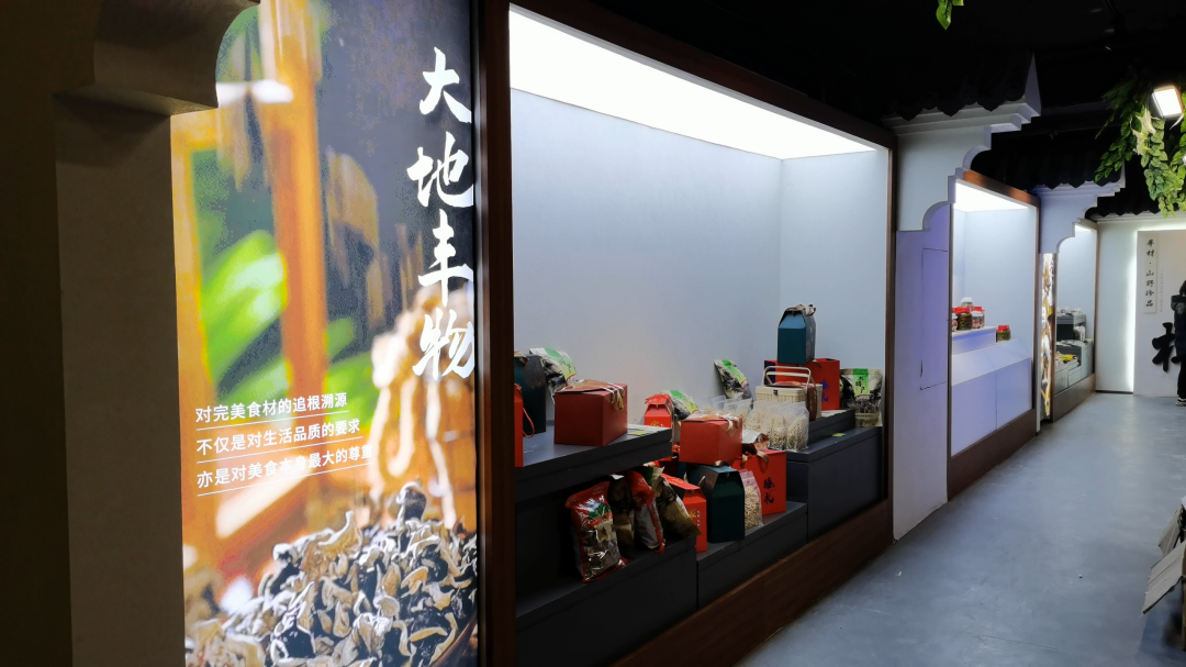 商業(yè)面積658平方米,以竹溪四貢(貢水、貢木、貢米、貢茶)為設(shè)計(jì)出發(fā)點(diǎn),以尋器、尋材、尋味布局產(chǎn)品結(jié)構(gòu),產(chǎn)品細(xì)分為尋器(漆器、陶藝)、尋材(山野珍品、蜂蜜、干菜類)、尋味(蒸盆、蒸盆原材料、調(diào)料、辣子醬、臘肉類)、尋貢(貢茶、貢米、貢水、貢木)。