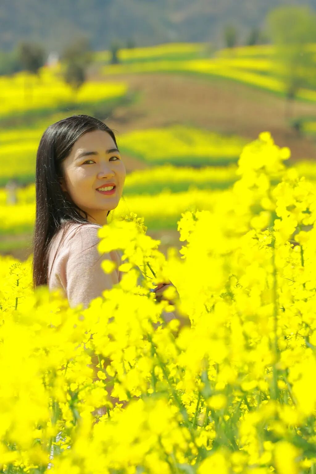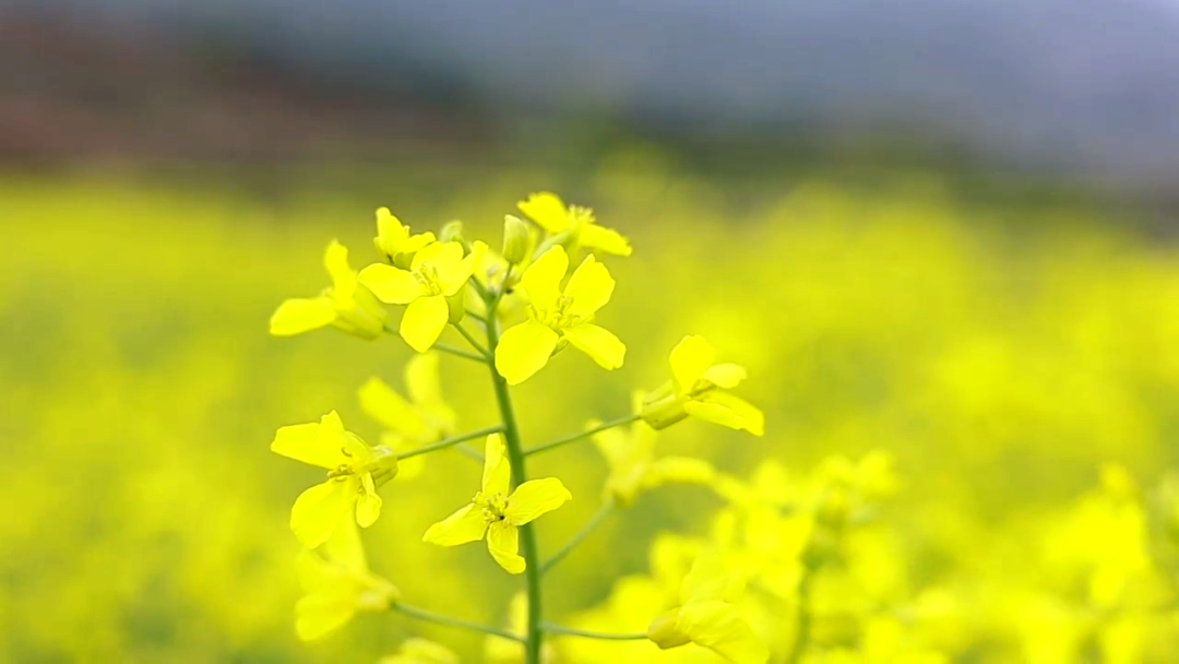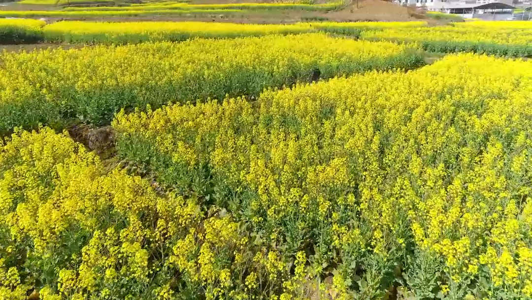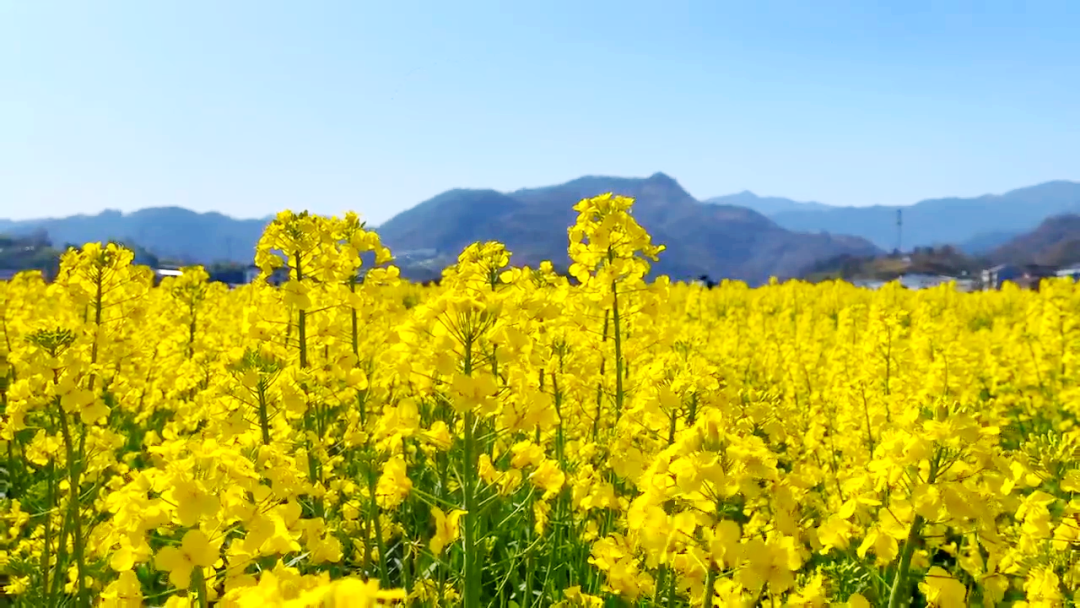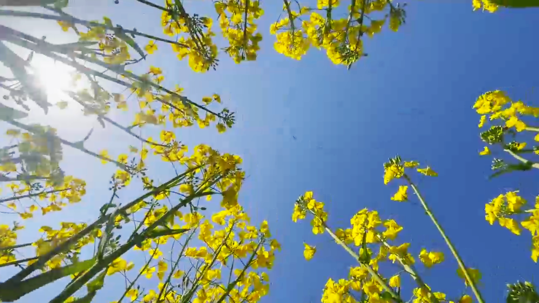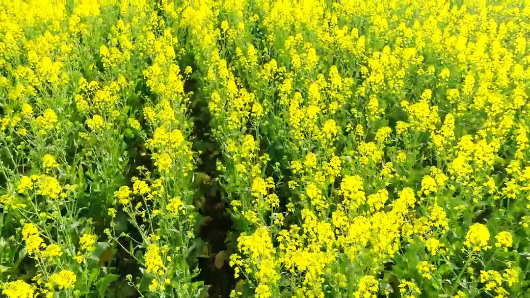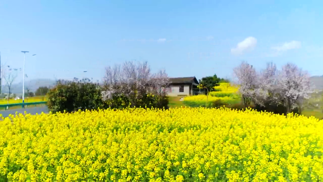 藍(lán)天白云,阡陌小道,開(kāi)闊的地面染上明快的黃色,滿目明亮,一眼望去,花色浮動(dòng),隨風(fēng)搖曳,似吹皺的一池春水,動(dòng)人而明亮的色彩跳動(dòng)在廣袤的田野上。