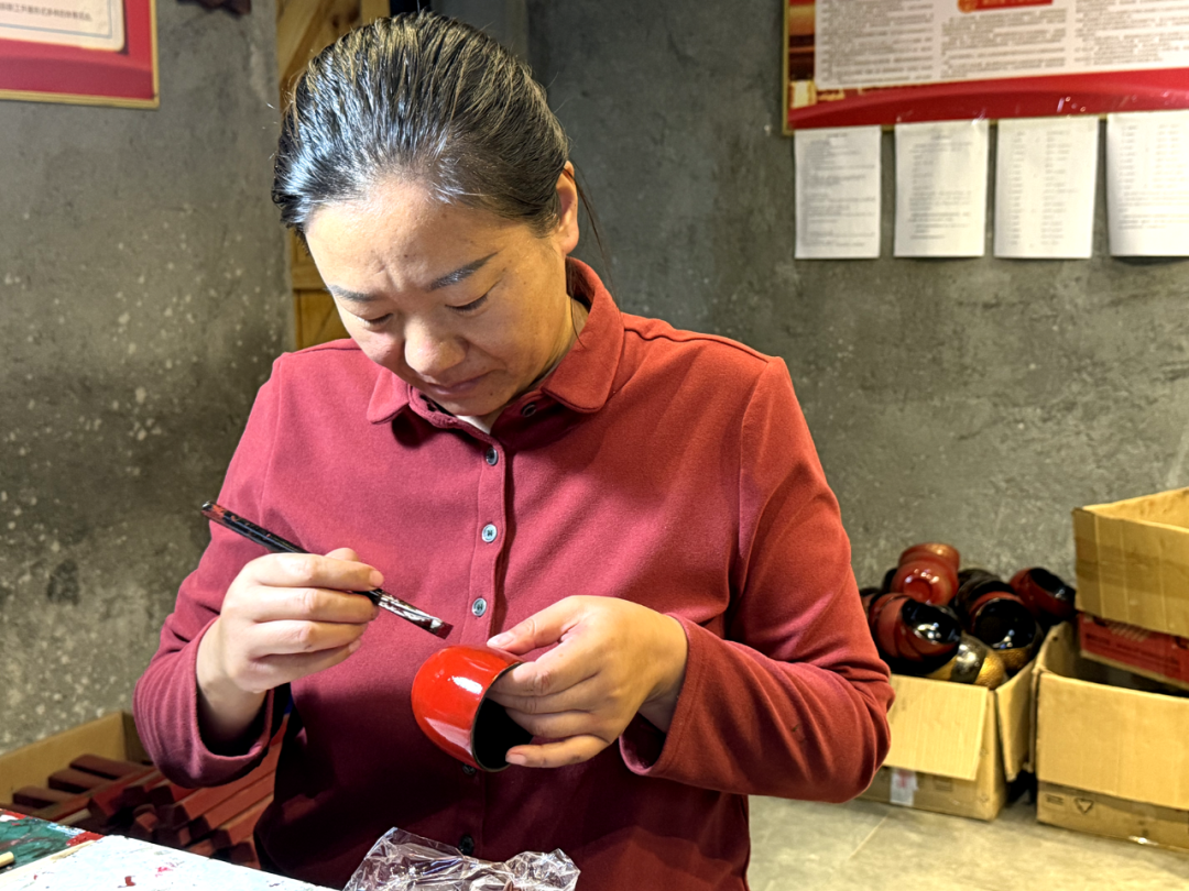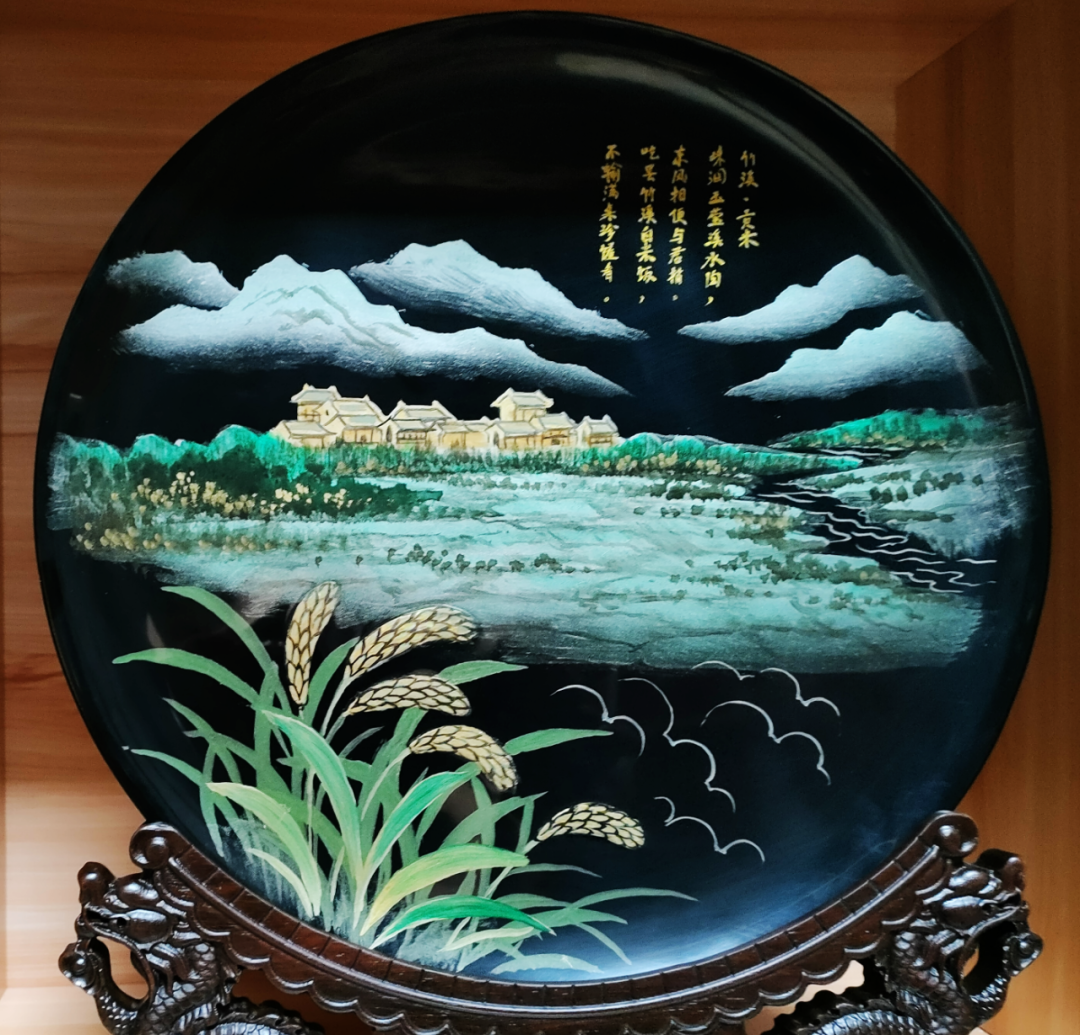 “這是我們最新創作的貢米、貢茶、貢木系列漆盤,成為竹溪漆藝代表作?!比珖l村工匠、竹溪縣“金漆世家”第四代傳承人張曉蓮介紹道。