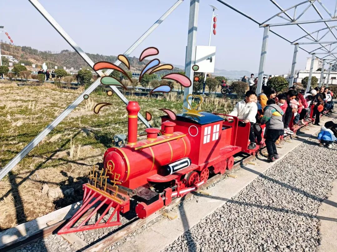 據悉,園區新引入的田間軌道觀光小火車,最多可容納20位乘客,全程約1公里。火車緩慢前行,汽笛聲聲,笑聲陣陣,人們盡情歡呼吶喊,讓人仿佛穿越進了世外桃源。