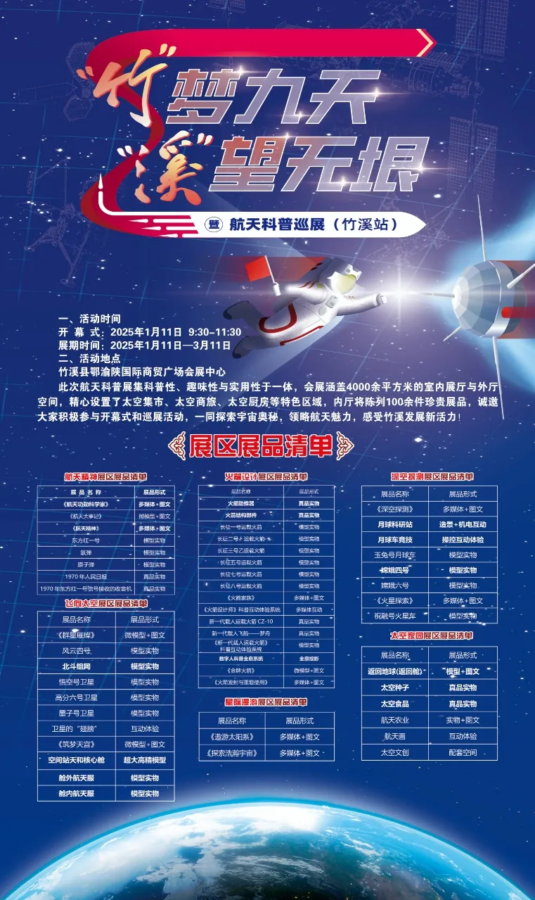 本次航天科普巡展不僅是一場科普盛宴,還兼具趣味性與實用性。期間,將同步開展招商引資、項目推介以及竹溪農特產品展銷等活動,助力竹溪經濟與文化發展。