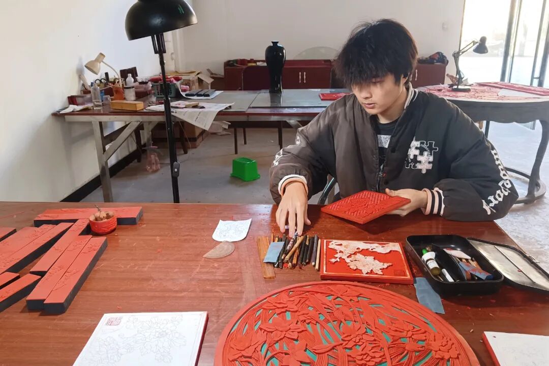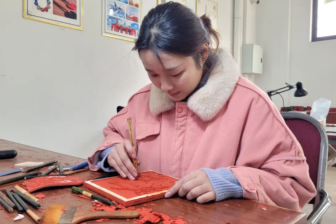 “00后”美女彭心竹伏案而坐,專心致志地在一塊漆好的木板上來回勾勒,刻刀隨氣息起伏游走,一吐一納、手起刀落,一幅精美的富貴牡丹圖若隱若現。