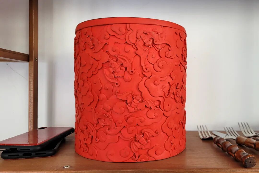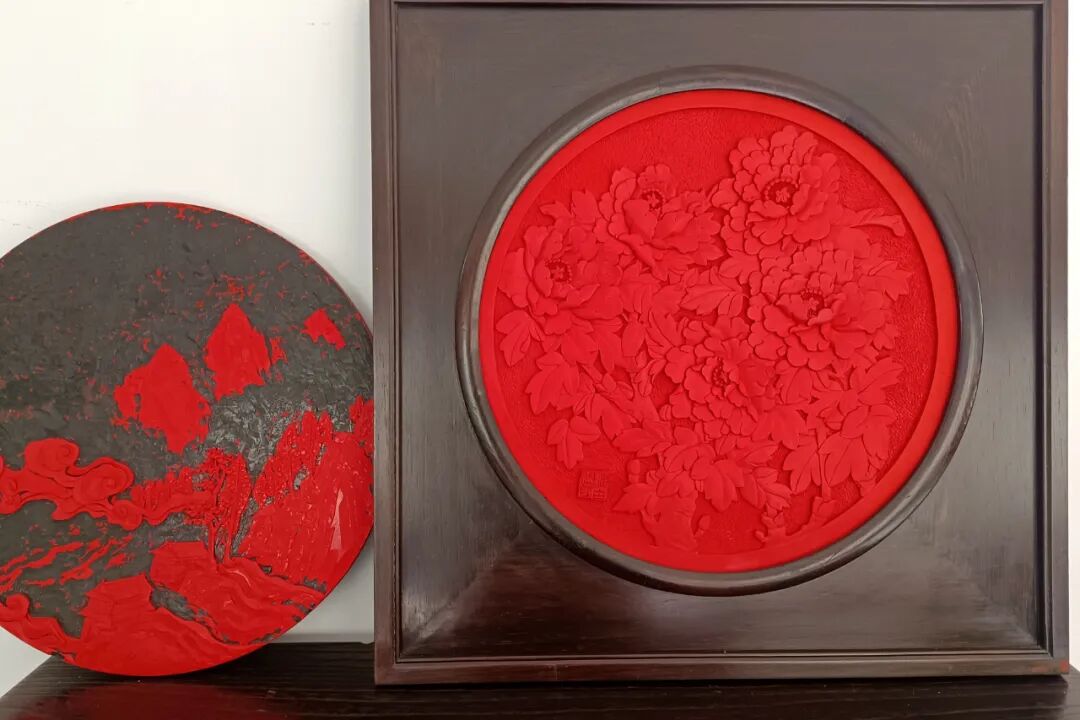 與現代的噴漆工藝不同,彭心竹正在進行的雕漆是以大漆為原料,在胎胚上涂抹出一定厚度,再用刀雕刻出花紋的技法。需要經過畫圖、制漆、髹漆、雕刻和打磨等百余道工序純手工完成。工作時,需目注心凝,時刻保持下刀的節奏,一氣呵成,通過腕力的細微變化控制刻線的粗細、深淺和虛實變幻,若有毫厘差池都會導致作品前功盡棄。