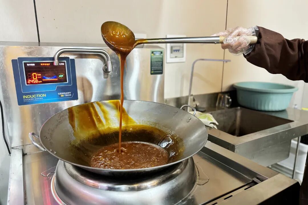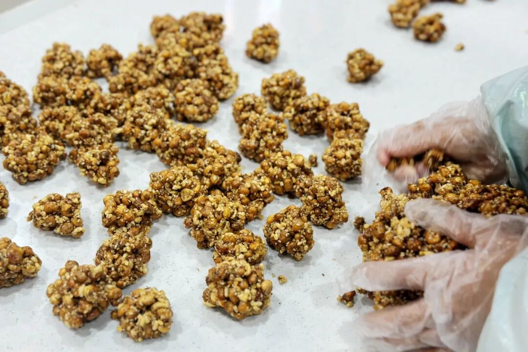 制作麻糖的首要環節是選材,馮妮麻糖的原材料都來自竹溪本地的深山農家食材,顆顆精選優質的糯米和飽滿的芝麻,堅持用上乘的食材成就純正的美味。“我們選用家鄉食材,一方面可以保證麻糖的品質地道,另一方面也增加了當地農戶的收入?!瘪T艷說道。熬糖環節是麻糖好吃的關鍵,這需要極大的耐心和精湛的技藝。麥芽糖在鍋里慢慢熬制,師傅一刻也不敢松懈,不斷地攪拌著,觀察著糖液的變化。