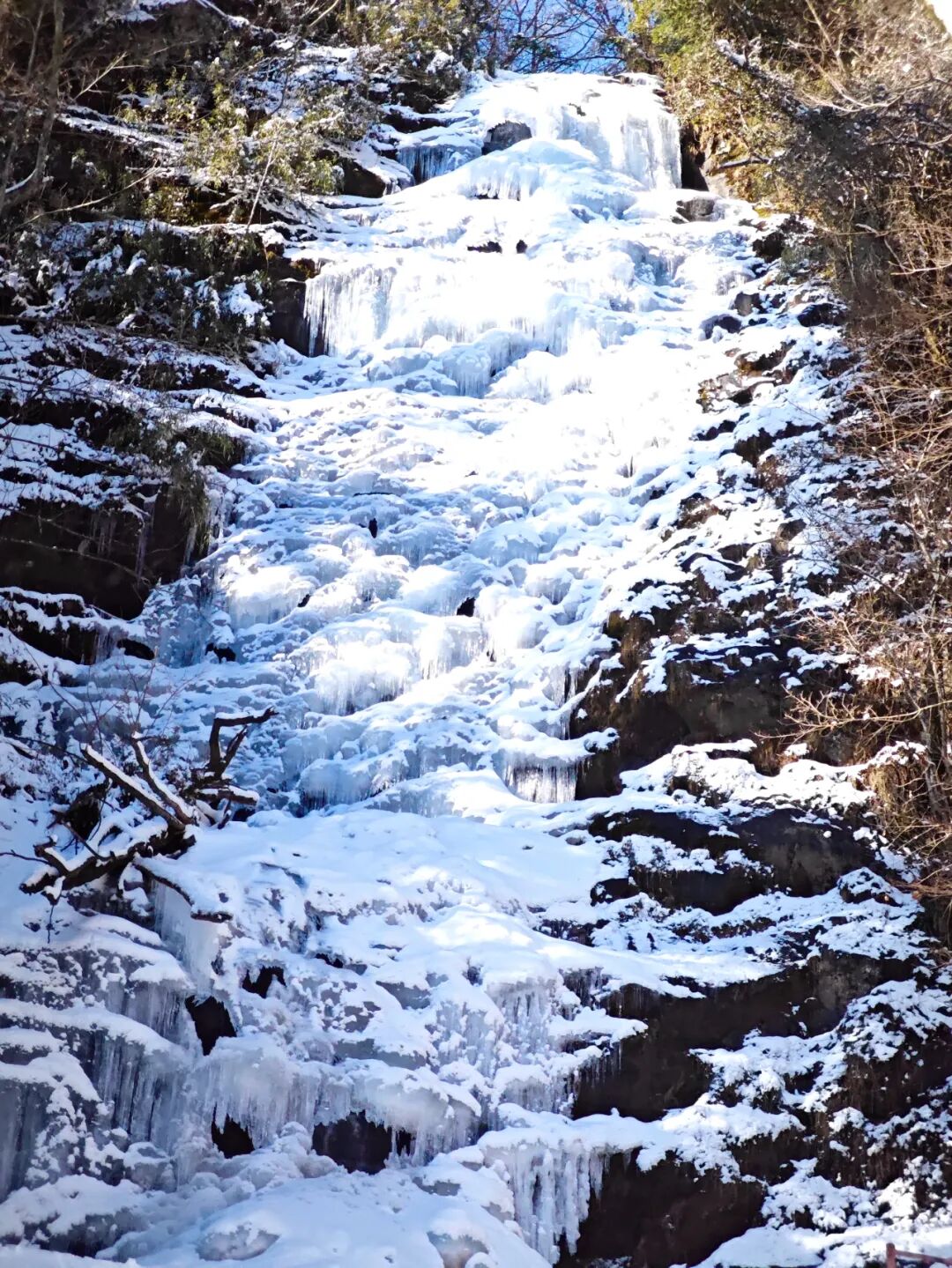 隨著氣溫的微妙變化,冰瀑表面不斷經(jīng)歷著解凍與再凍的過程,形成了錯落有致的冰柱,層層疊疊,變化無窮。在陽光的照耀下,冰瀑仿佛被賦予了生命,每一面都閃耀著耀眼的光芒,如同精心雕琢的明鏡折射出五彩斑斕的光影,美不勝收。