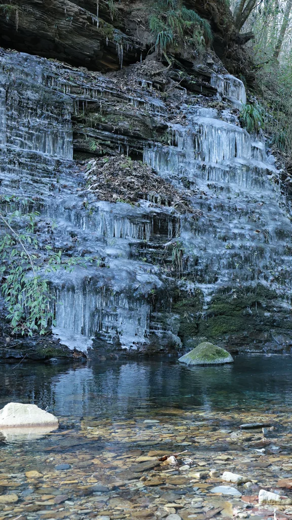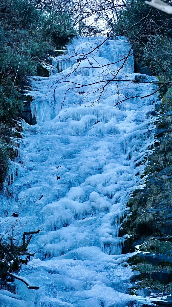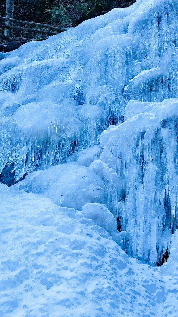 這些冰瀑源自山間細流,在零下十幾度的嚴寒中緩緩凝結,最終形成了與峭壁并肩的壯麗冰瀑。半透明的冰體在陽光下閃耀著淡藍色的光輝,宛如仙境中的珠簾玉幕,令人嘆為觀止。