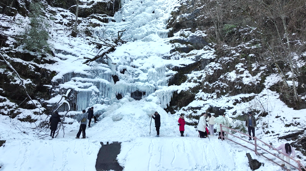 據(jù)悉,每年12月至次年2月間為營盤山冰瀑的最佳觀賞期,今年更是早在元旦前就已成型。冷空氣的降臨使得景區(qū)氣溫驟降,瀑布水流逐漸凝固,形成“懸崖百丈冰”的壯闊景象,為冬日的營盤山披上一層銀裝素裹的華服。