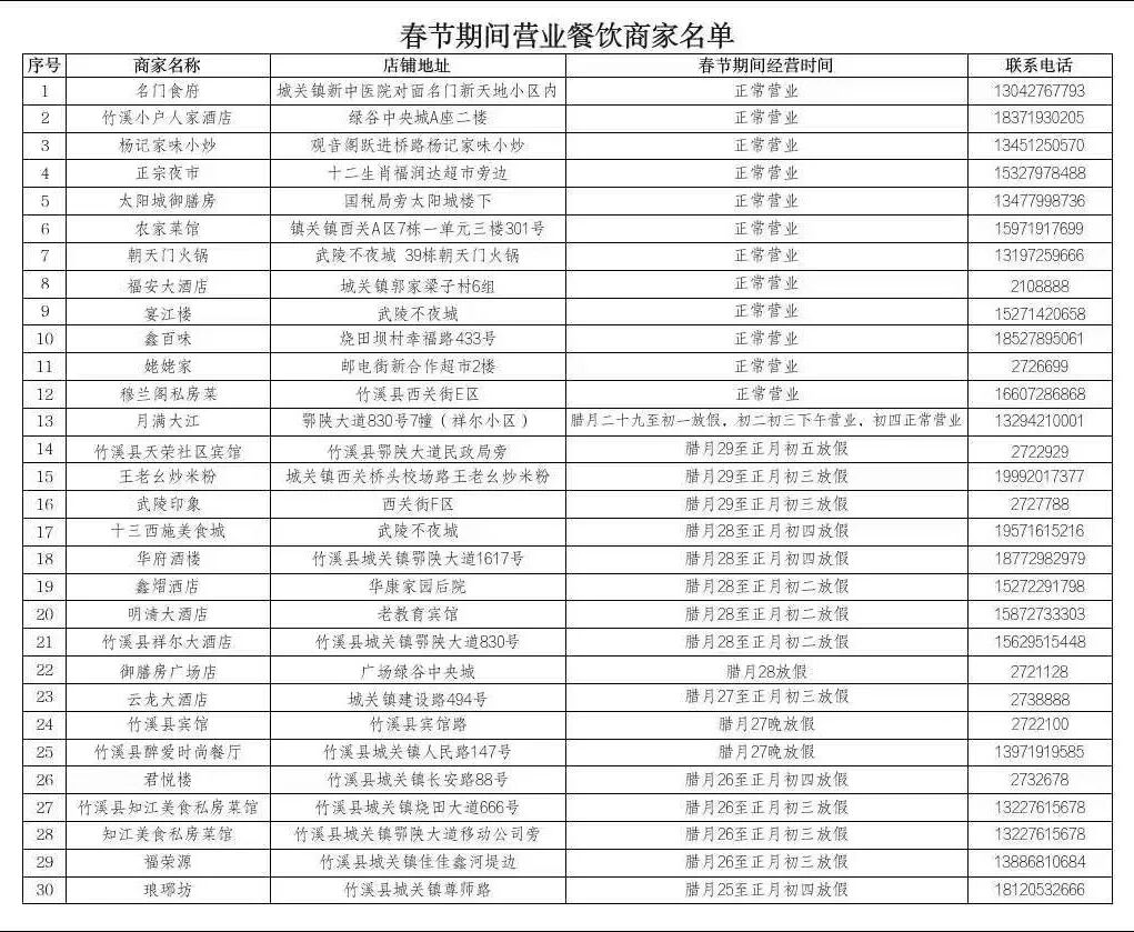 春節臨近,在這闔家歡樂、喜慶吉祥的時刻。為熱情迎接本地居民和外地游客,竹溪縣市場監督管理局組織了一批具有地方特色的春節不打烊的餐飲單位在節日期間繼續為大家帶來美味與歡樂,保證各位游客和消費者能夠在春節期間品嘗到地道的竹溪美食。希望這份指南能為遠道而來的各位游客朋友和廣大居民們提供就餐參考,讓大家吃得安心、放心、開心歡歡喜喜過大年。