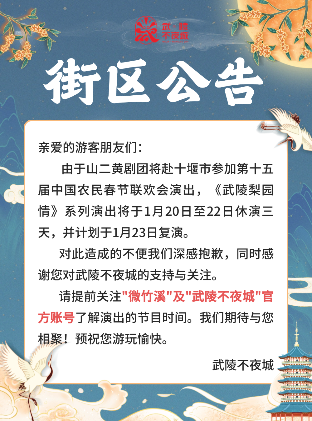 注意,武陵不夜城發(fā)布街區(qū)公告,將于1月20日-1月22日暫停演出。1月23日恢復(fù)晚間節(jié)目演繹,請(qǐng)大家相互轉(zhuǎn)告,不要跑空啦。