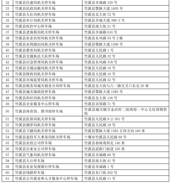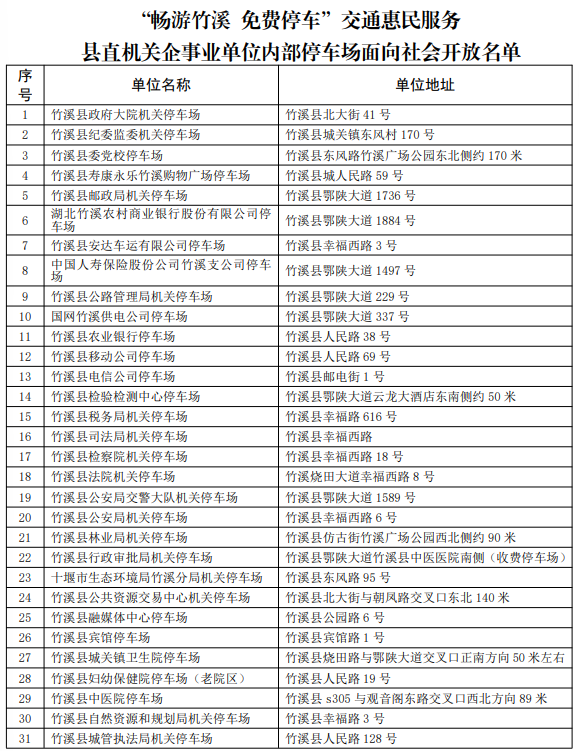 附:“暢游竹溪 免費(fèi)停車”交通惠民服務(wù)縣直機(jī)關(guān)企事業(yè)單位內(nèi)部停車場(chǎng)面向社會(huì)開放名單