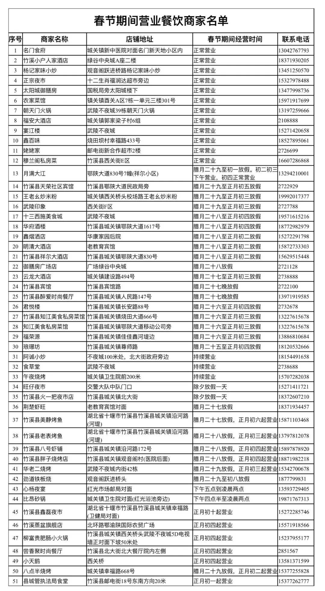 春節(jié)臨近,為熱情迎接本地居民和外地游客,竹溪縣一批具有地方特色的餐飲商家春節(jié)不打烊,在節(jié)日期間繼續(xù)為大家?guī)砻牢杜c歡樂,保證各位游客和消費者在春節(jié)期間能夠品嘗到地道的竹溪美食。春節(jié)期間營業(yè)餐飲商家名單如下:
