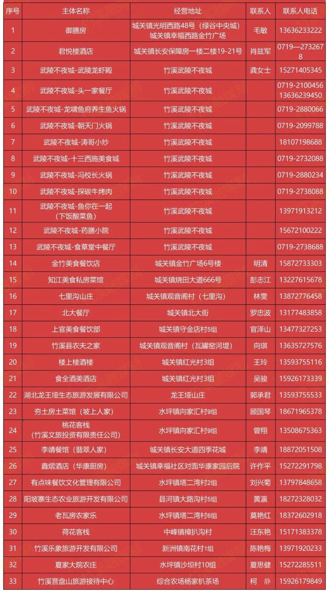 為方便大家出游就餐、住宿,小編特地為大家搜集整理了竹溪縣部分餐飲門店、酒店民宿、夜市、景區(qū)景點、旅游購物、休閑娛樂地址和聯(lián)系方式附后,大家可以收藏起來,趁假期來竹溪賞美景、品美食、購好物。