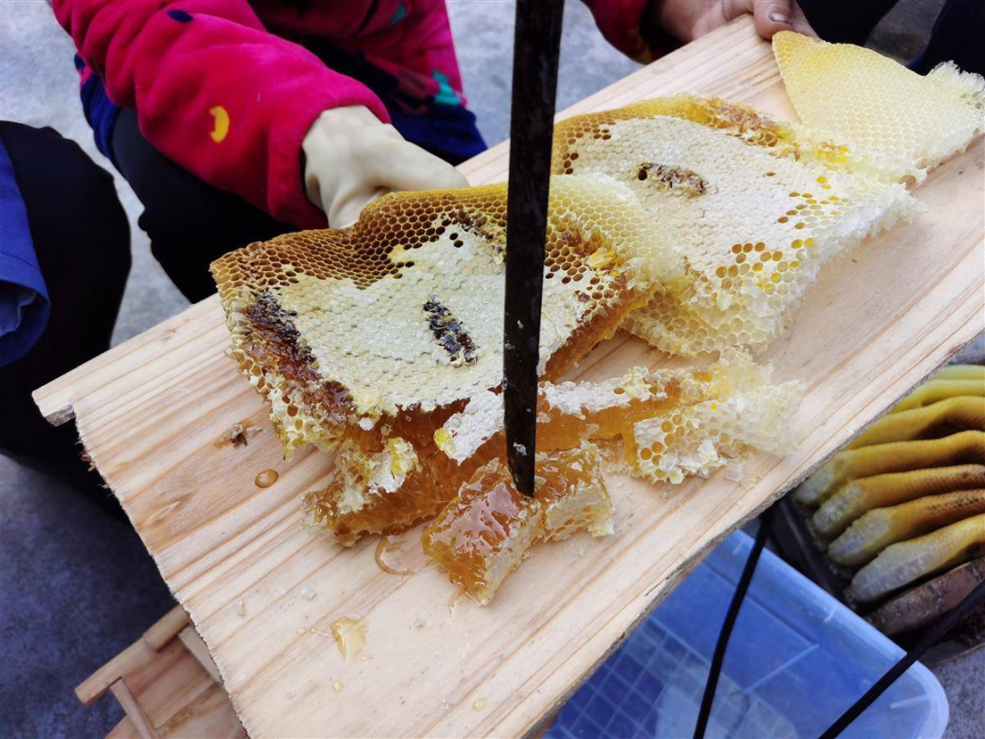 公司采用獨(dú)特的“直管+托管”模式,聘用當(dāng)?shù)亟?jīng)驗豐富的蜂農(nóng)作為專業(yè)養(yǎng)蜂員,承擔(dān)部分蜂箱的日常管護(hù)工作。對于另一部分蜂箱,公司面向全縣召集“托管員”,村民可承包數(shù)量不等的蜂箱。年紀(jì)稍大的村民當(dāng)起了“兼職”養(yǎng)蜂人,既不用賦閑在家,又可根據(jù)自身情況量力而行,輕松變“蜜”為“金”。“村民產(chǎn)多少,我們收多少,目前已帶動超五十人養(yǎng)蜂。今年‘養(yǎng)蜂團(tuán)’還有新成員加入,桃源鄉(xiāng)的華德付一下就承包了三十多箱呢!”席輝介紹。