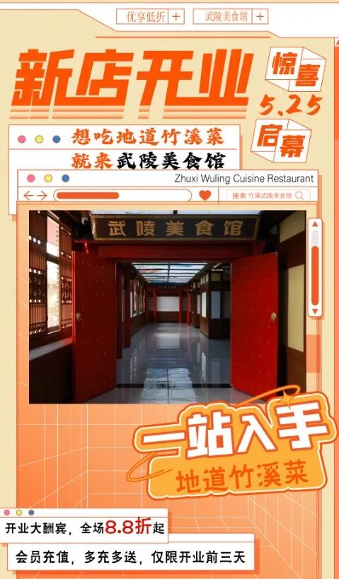?開業(yè)折扣享不停:5月25日-5月27日,全場菜品8.8折優(yōu)惠(不包含酒水飲料),讓您用實惠的價格,品嘗地道美味的竹溪菜!