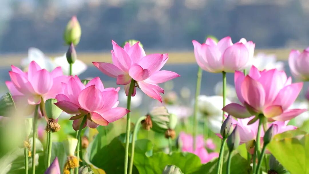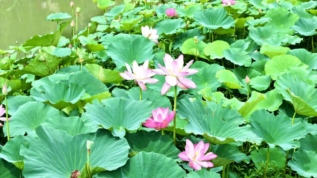 荷花開得正盛,粉的似霞、白的勝雪、間或幾枝緋紅如燃輕輕浮于水面。
