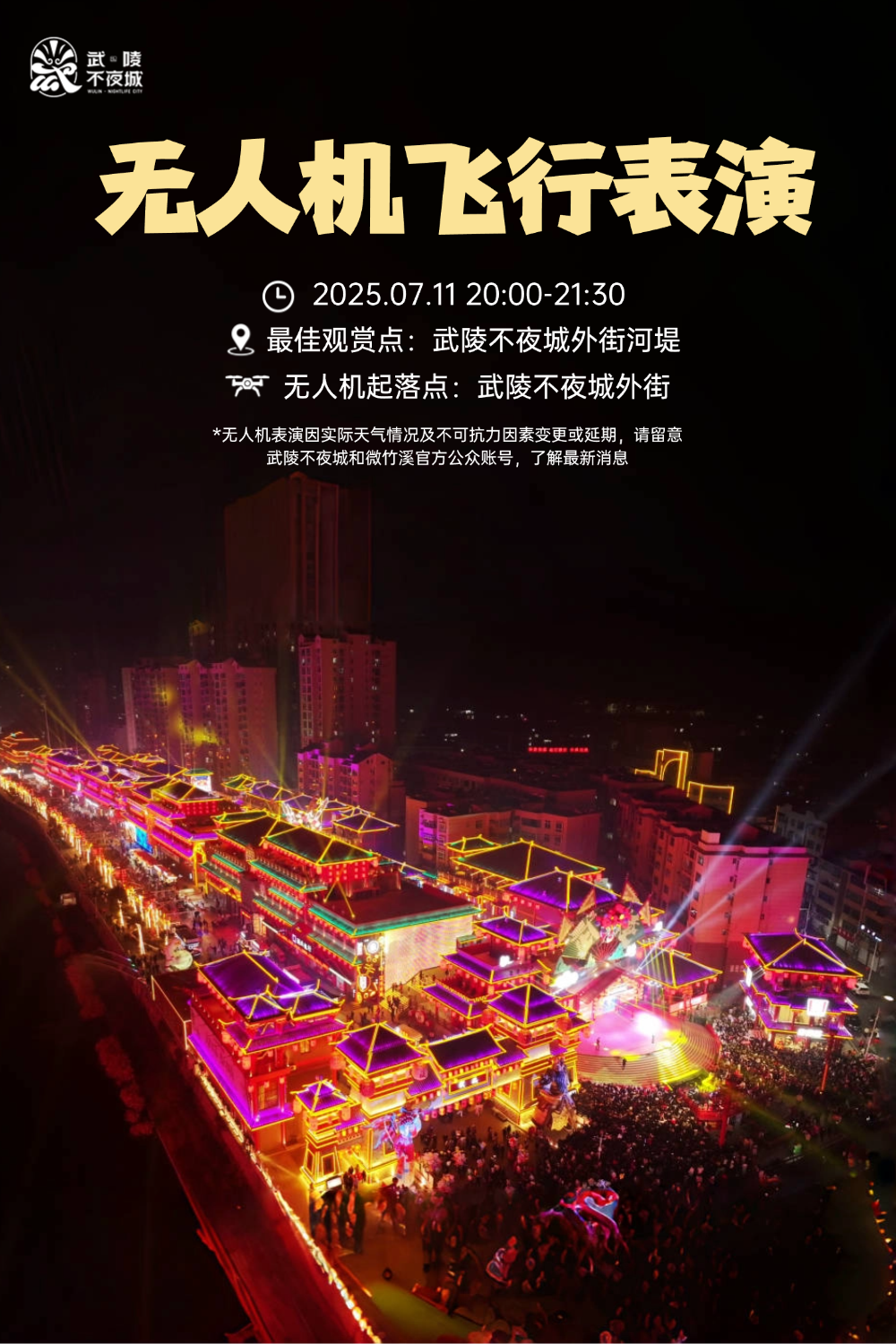 7月11日19:30-21:30,無人機表演秀準時點亮武陵不夜城上空當夢幻的燈光劃亮城市天幕。一場藝術與科技的視覺盛典,將燃“爆”溪城歡樂星光夜不見不散。