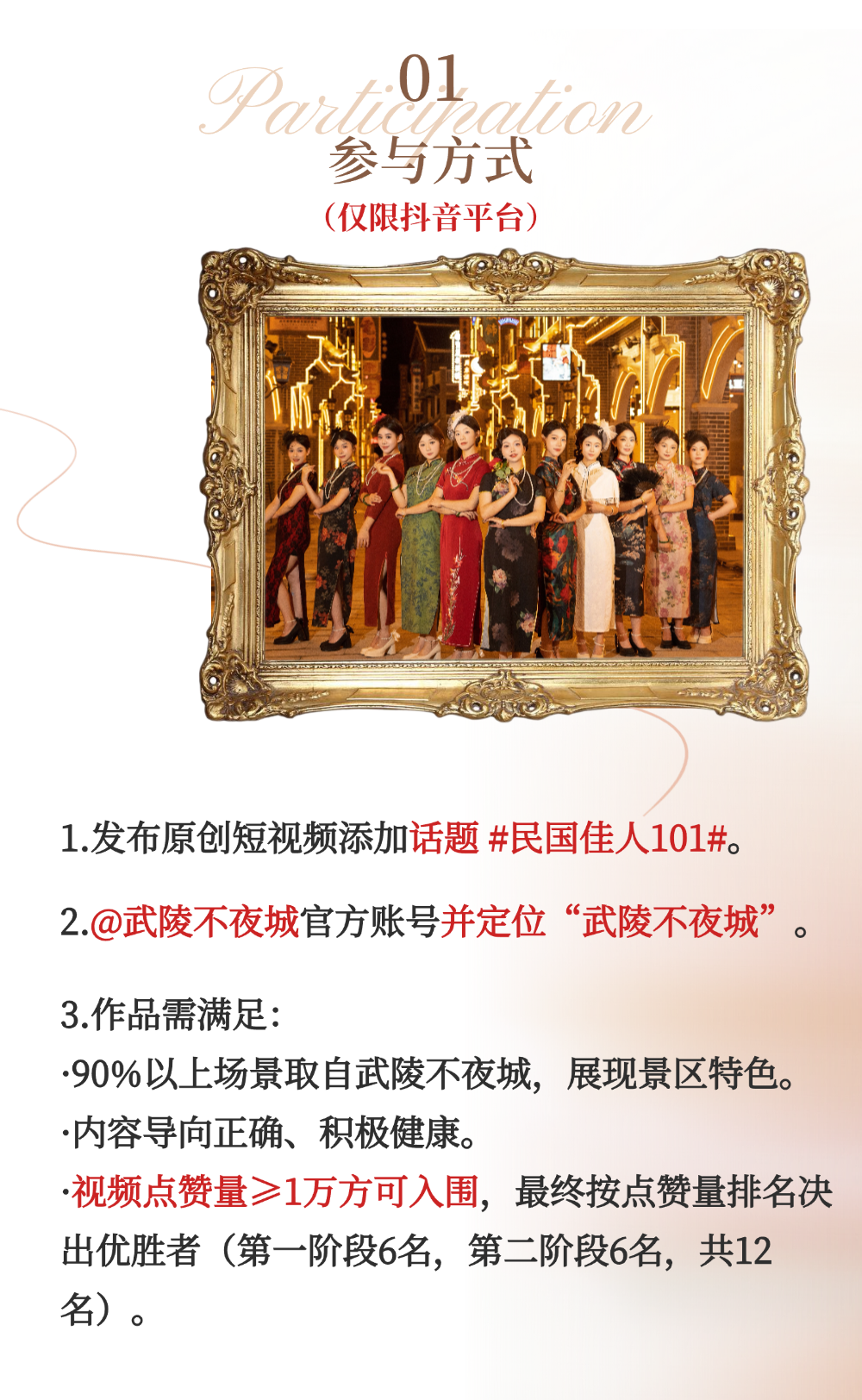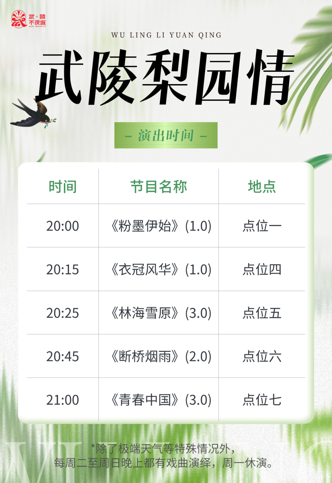 當(dāng)夜幕降臨燈火點(diǎn)亮武陵不夜城這片歡樂(lè)天地,傳統(tǒng)與現(xiàn)代元素在此激情碰撞。踏入其中,仿佛穿越時(shí)空,感受撲面而來(lái)的熱烈氛圍。一場(chǎng)場(chǎng)視聽(tīng)盛宴正等待著您來(lái)開(kāi)啟,現(xiàn)在為您呈上今日節(jié)目單準(zhǔn)備好迎接這場(chǎng)難忘的文化狂歡吧!