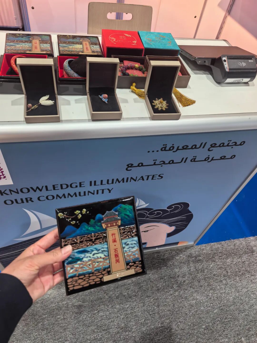 展會現場星辰大海漆珠飾品溫潤如玉,朱漆金竹福瑞主杯茶具流光溢彩引得中東客商駐足驚嘆。國際友人在參觀時贊嘆:“這不僅是藝術品,更是人與自然共生的東方智慧!”