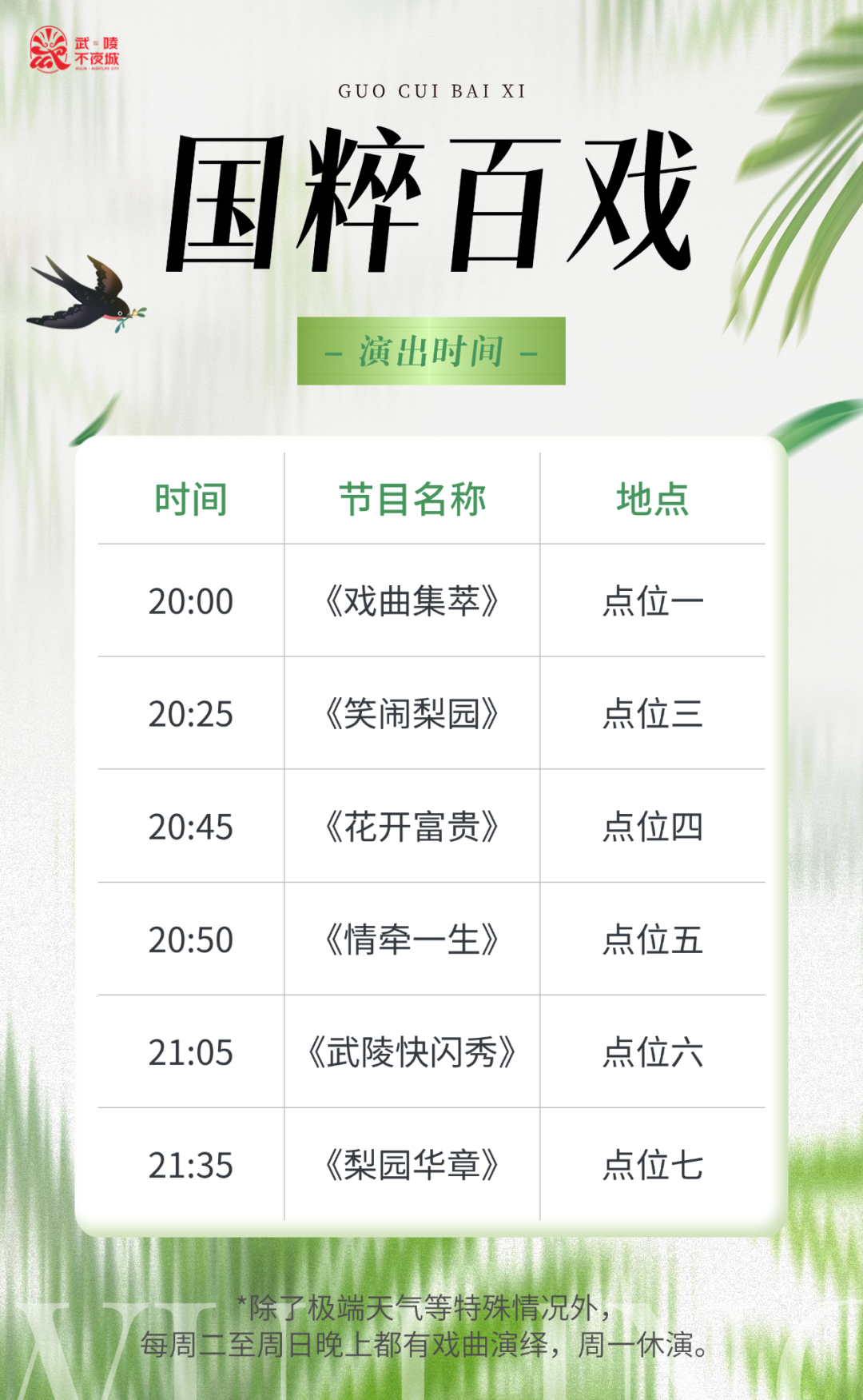 當(dāng)夜幕降臨燈火點(diǎn)亮武陵不夜城這片歡樂(lè)天地,傳統(tǒng)與現(xiàn)代元素在此激情碰撞。踏入其中,仿佛穿越時(shí)空,感受撲面而來(lái)的熱烈氛圍。一場(chǎng)場(chǎng)視聽(tīng)盛宴正等待著您來(lái)開(kāi)啟,現(xiàn)在為您呈上今日節(jié)目單準(zhǔn)備好迎接這場(chǎng)難忘的文化狂歡吧!