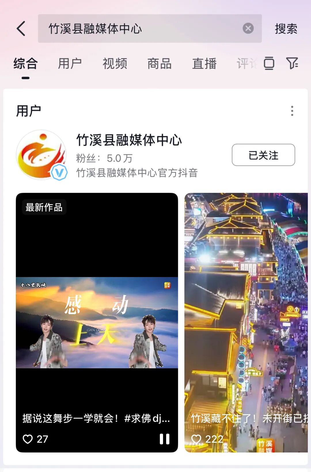 打開【抖音】APP點擊搜索框最右邊的“相機”符號進行識別關注【竹溪縣融媒體中心】官方抖音