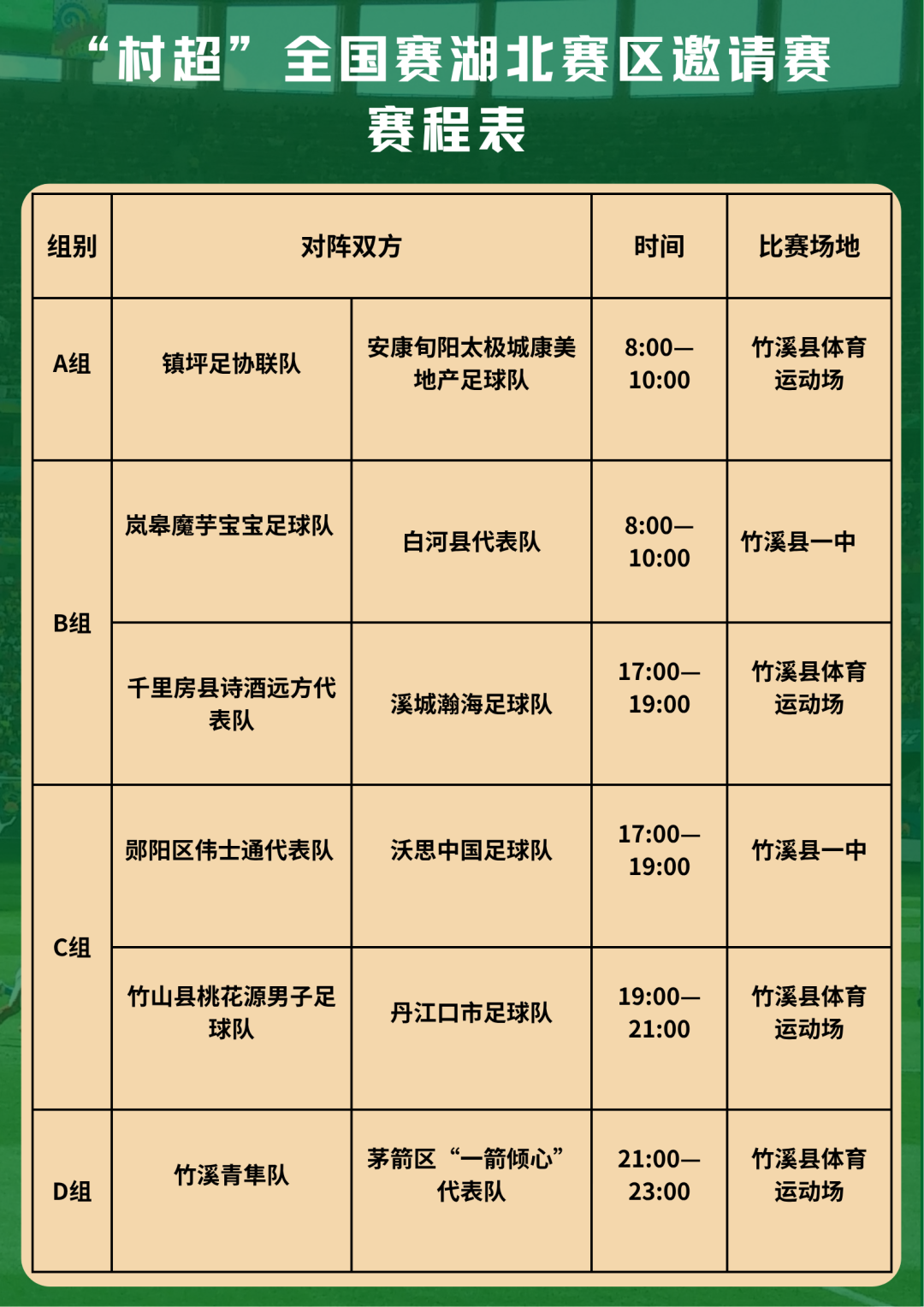 為做好竹溪“村超”賽事信息播報,讓大家實時掌握最新賽況和賽程安排。自7月19日起微竹溪將為您奉上竹溪“村超”每日播報,持續推出賽事相關訊息讓您了解最新、最全、最快的賽事信息敬請關注: