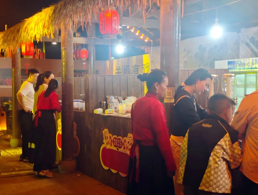 歌舞漸歇,不遠(yuǎn)處的燒烤區(qū)早已香氣四溢。景區(qū)特別設(shè)置的燒烤攤、小炒檔與酒吧前擠滿了食客。滋滋作響的烤肉、香氣撲鼻的小炒與冰鎮(zhèn)飲品,成了驅(qū)散疲憊的最佳選擇。