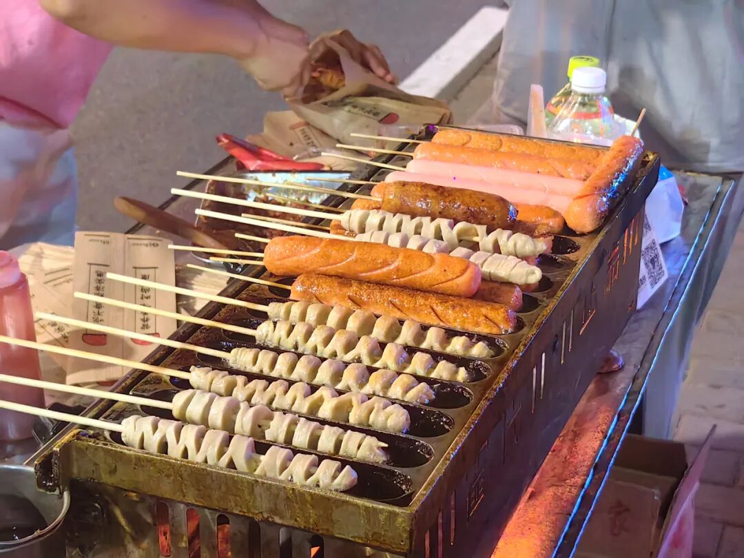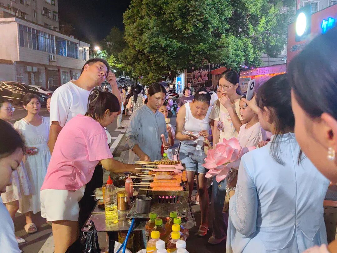 夕陽為賽場鍍上金輝時,熱鬧從場內(nèi)蔓延到場外。竹溪縣體育場外的街巷,成了煙火氣的舞臺。橙紅色的霞光里,彩色冰粉推車亮著霓虹,烤串的孜然香漫過圍欄,印著足球圖案的文化衫在人群中穿梭。橘黃色燈桿下,烤腸攤的鐵槽里油花“滋滋”翻滾,攤主放串、撒料、打包一氣呵成,孩子們踮著腳盯著烤得焦黃的淀粉腸,眼里滿是期待。冰鎮(zhèn)汽水的開瓶聲混著主裁判的哨聲,成了夏夜最動聽的背景音。